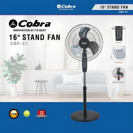 السعر الأصلي هو: 33,00 د.ك.27,00 د.كالسعر الحالي هو: 27,00 د.ك.مروحة ستاند كوبرا 16 بوصة CBF-31 – أداء قوي