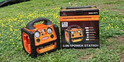 جهاز 6×1 بقوة 1800 أمبير مع ضاغط هواء، محطة طاقة محمولة مع منفاخ إطارات بقوة 260 رطل لكل بوصة مربعة، تشغيل السيارات ، عاكس طاقة بقوة 400 واط، منفذي تيار متردد/مستمر مزدوجين