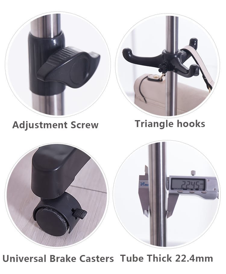 المواد: 430 أنبوب مركب من الفولاذ المقاوم للصدأ و ABS الحجم: حوالي 78 × 42 × (96-160) سم / 30.7 * 16.53 * (37.7-62.99) باللون: أسود ، عاجي 1: قضيب واحد غير قابل للتطوير ، ارتفاع قابل للتعديل. 2: مع خطافين من ثلاثة مخالب ، يمكنك تعليق حقائب اليد والأوشحة وربطات العنق وما إلى ذلك. 3: قضبان مزدوجة في التصميم السفلي ، يمكنك وضع الأحذية والأشياء الأخرى. 4: تصميم العجلات والحركة والكبح مريح للغاية 5: داخلي ، غرفة معيشة ، شرفة ، مجموعة متنوعة من استخدام الفضاء. تتضمن العبوة: 1 × رف ملابس 1 × تعليمات“