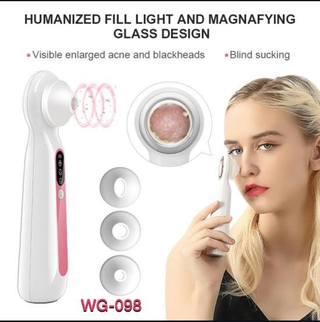 جهاز لإزالة الرؤوس السوداء، يتميز بتصميم مزود بإضاءة تعبئة وعدسة مكبرة. كما يضم المنتج مع رؤوس شفط مختلفة الأحجام، ويبرز قدرته على التعامل مع حب الشباب والرؤوس السوداء المرئية.