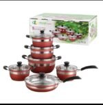 طقم أواني طهي فاخر من الستانلس ستيل – 12 قطعة باللون الأحمر