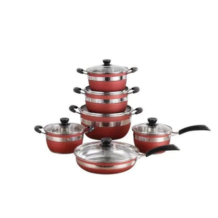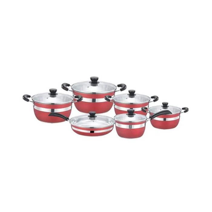 طقم أواني طهي فاخر من الستانلس ستيل – 12 قطعة باللون الأحمر