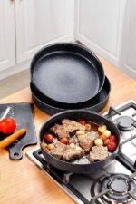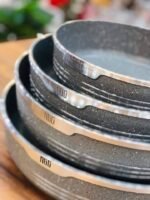 ارتاحي في المطبخ مع طقم صواني جرانيت مستديرة من HotChef ، جودة عالية وتصميم عملي يناسب كل بيت خليجي. الطقم يجي بثلاث مقاسات مختلفة، وكل صينية مصنوعة من جرانيت قوي ومتين، غير لاصق، وسهل التنظيف، يعني طبخ من غير تعب ولا التصاق.