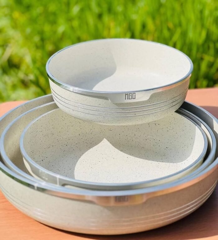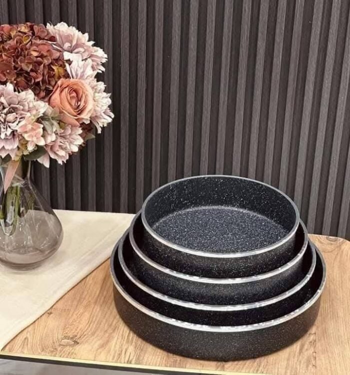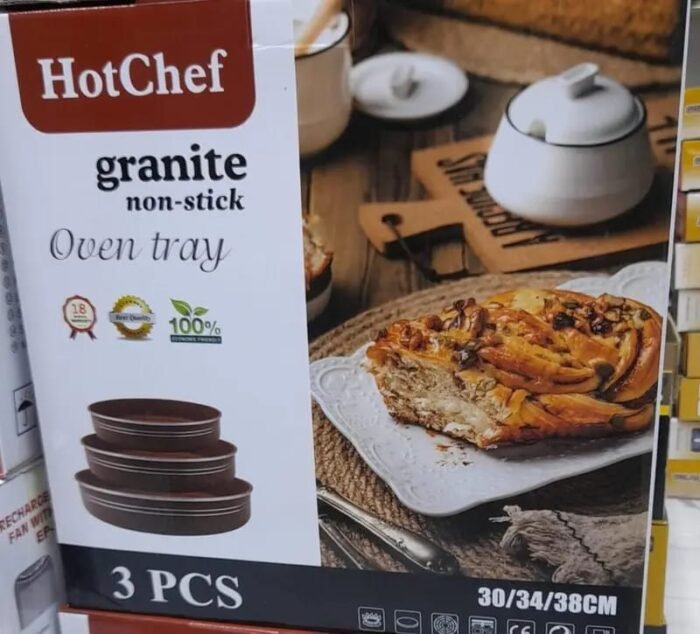 ارتاحي في المطبخ مع طقم صواني جرانيت مستديرة من HotChef ، جودة عالية وتصميم عملي يناسب كل بيت خليجي. الطقم يجي بثلاث مقاسات مختلفة، وكل صينية مصنوعة من جرانيت قوي ومتين، غير لاصق، وسهل التنظيف، يعني طبخ من غير تعب ولا التصاق.