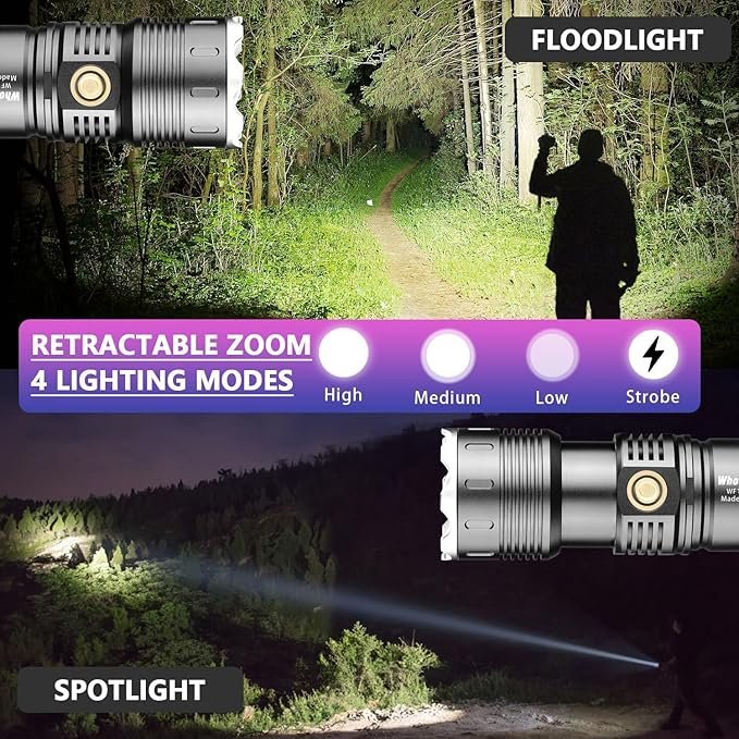 【مصباح يدوي قابل للتكبير】: يمكن لهذه المصابيح اليدوية القوية تمديد رأس المصباح اليدوي لضبط البعد البؤري للمصباح اليدوي. ايوفر ضوء الكشاف العريض إضاءة واسعة للمناطق الكبيرة، مما يمنحك رؤية ساطعة وواسعة أثناء المشي ليلًا، بينما يساعدك ضوء الكشاف المركز على الرؤية بعيدة المدى بدقة، مما يسهل عليك بدقة اكتشاف مجال الرؤية.