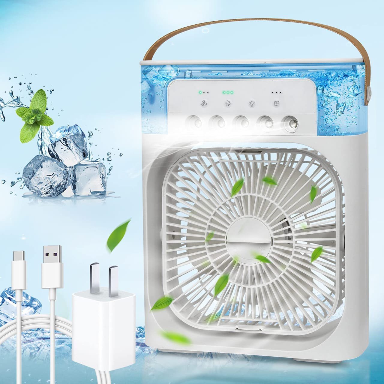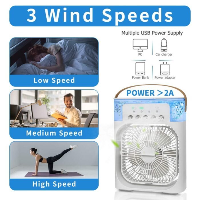 مروحه مكيف هواء محمولة، مبرد هواء تبخيري صغير مع إضاءة LED بـ 7 ألوان، ومؤقت، و3 سرعات للرياح، و3 أوضاع للرش، و600 متر