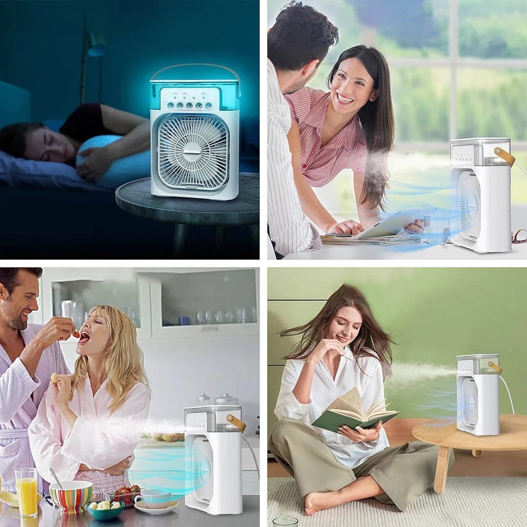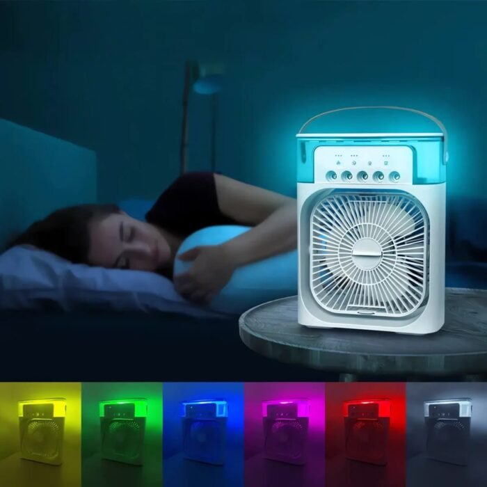 مروحة رذاذ الماء مع إضاءة ليلية 4 في 1 – تبريد، ترطيب، تعطير، إضاءة