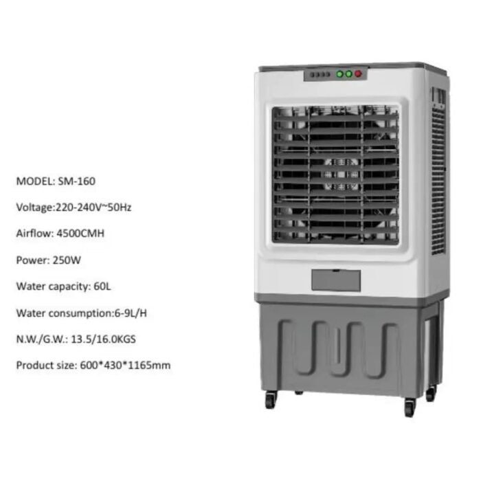 مكيف صحراوي بسعة 60 لترًا وقدرة 250 واط، مزوّد بصندوقين للثلج لتحسين التبريد و3 سرعات للتحكم — مثالي للاستخدام في المساحات المتوسطة والمنزلية، مع عجلات لسهولة الحركة.