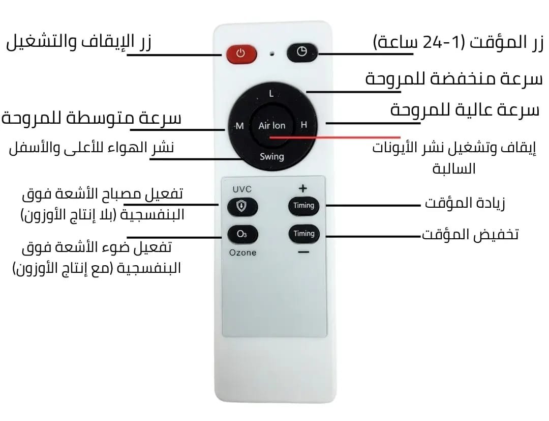 جهاز تحكم عن بعد: للتحكم في سرعات الهواء، المؤقت، تشغيل الأشعة فوق البنفسجية، الأيونات، والأوزون.